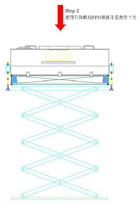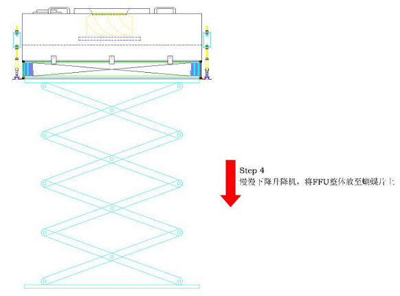 FFU安裝指導(dǎo)指南步驟5:移走升降機,完成FFU箱體及高效過濾器的安裝,如下圖所示: