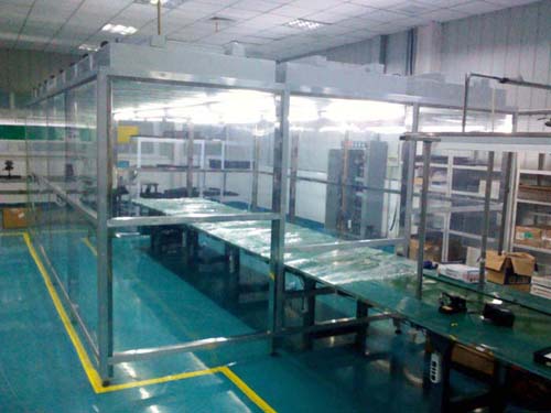 潔凈棚采用工業(yè)鋁材(或不銹鋼方通、鐵方通噴塑)作為框架,風(fēng)機(jī)濾網(wǎng)機(jī)組(FFU)送風(fēng),四周懸掛防靜電垂簾(或鋼化玻璃),其內(nèi)部凈化級(jí)別可達(dá)到100-10000級(jí)。適用于操作區(qū)內(nèi)局部凈化級(jí)別要求高的區(qū)域。