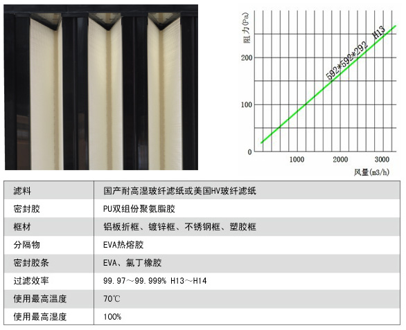 2.濾料采用耐高濕超細(xì)玻璃纖維濾紙制成,以鋁箔板做分隔。波紋形紙隔板或鋁隔板維持每一褶紙之間等距間隔,氣流易于穿過(guò),確保濾材有效利用及增加強(qiáng)度。