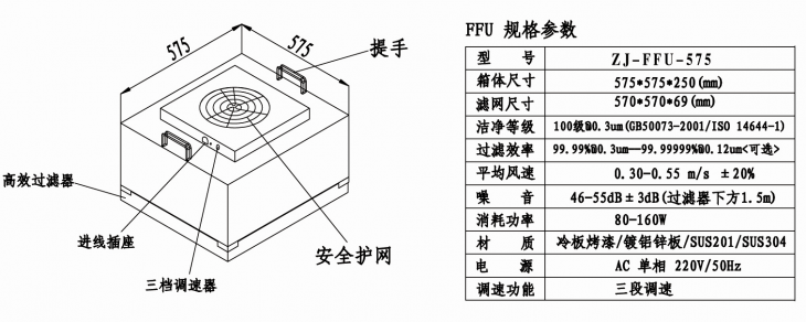 1.ZJFFU575FFU風(fēng)機(jī)外形尺寸(mm):575*575*320,噪聲52~56分貝;